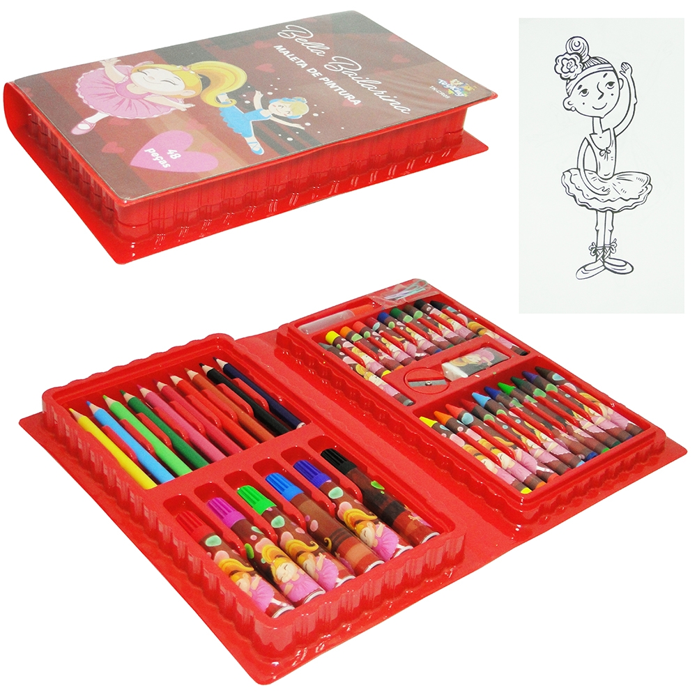 ESTOJO MALETA ESCOLAR BELLA BAILARINA COM LAPIS DE COR + GIZ DE CERA E ACESSORIOS 48 PECAS. CONTEÚDO DA MALETA: 6 PAPÉIS PARA DESENHO; 6 CANETINHAS HIDROCOR; 8 BASTÕES DE GIZ; 22 LÁPIS DE COR; 1 BORRACHA; 1 APONTADOR; 3 CLIPS; 1 COLA. COR: COLORIDO. COMPOSIÇÃO: PLASTICO, CERA, METAL E BORRACHA