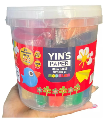 Balde com 30 pacotinhos de massinha de modelar coloridas. Produto não tóxico. À Base de amido. Não recomendado para crianças menores de 3 anos