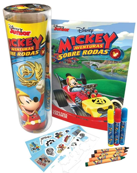Tubos Superdivertidos, eles vêm com 1 livro, cartela de adesivos, 1 estêncil, 4 gizes de cera e 3 canetinhas.