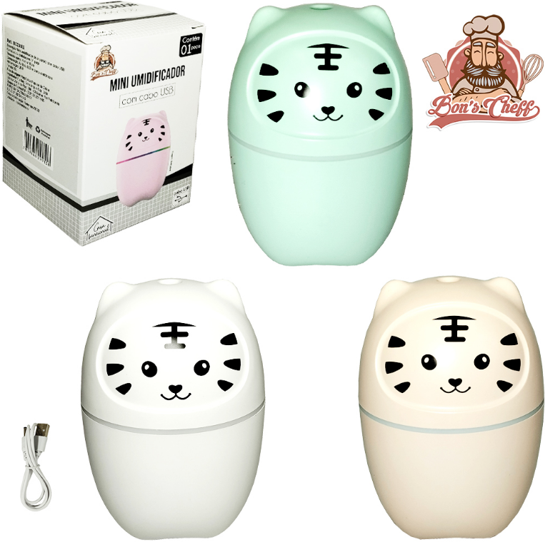 ALIMENTAÇÃO: CABO USB CAPACIDADE: 180ML TAMANHO APROXIMADO DO UMIDIFICADOR: 10X6CM TAMANHO APROXIMADO DA CAIXA: A:11XL:8XP:8CM PESO APROXIMADO: 100G TIPO DE PRODUTO: UMIDIFICADOR PARA AMBIENTES tigre COM LUZ COR: SORTIDAS COMPOSIÇÃO: PLASTICO E COMPONENTES ELETRONICOS